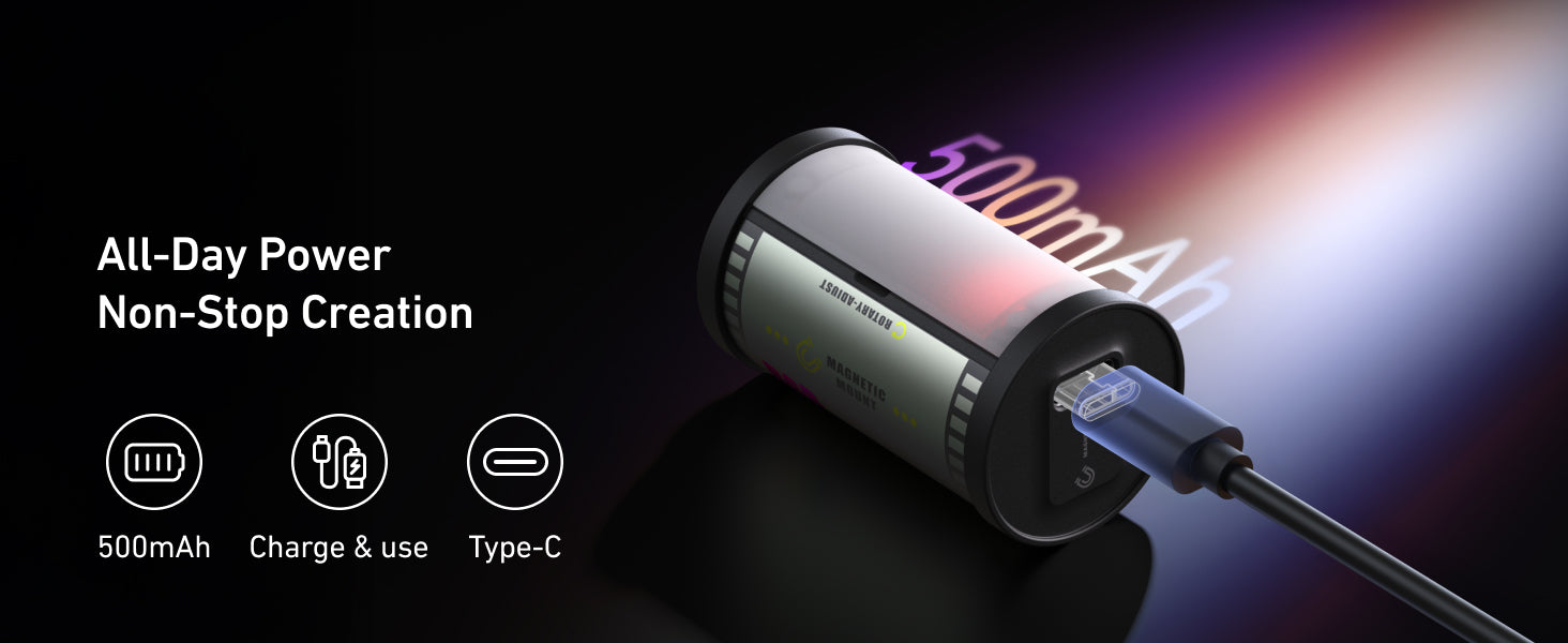 Create non-stop with the Action6 StreetGrip Kit. Thanks to its 500mAh battery, you can shoot for hours without worrying about battery life. The Type-C charging port means you can charge while using your equipment—ideal for extended shoots.