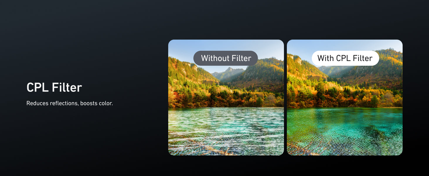 | Without Filter vs With CPL Filter | Strong reflections on glass or water, washed-out colors, less visible detail. | Reflections are reduced, colors look richer, and fine details behind glass or water pop out. | Clearer scenes with deeper color and less glare from reflective surfaces. |