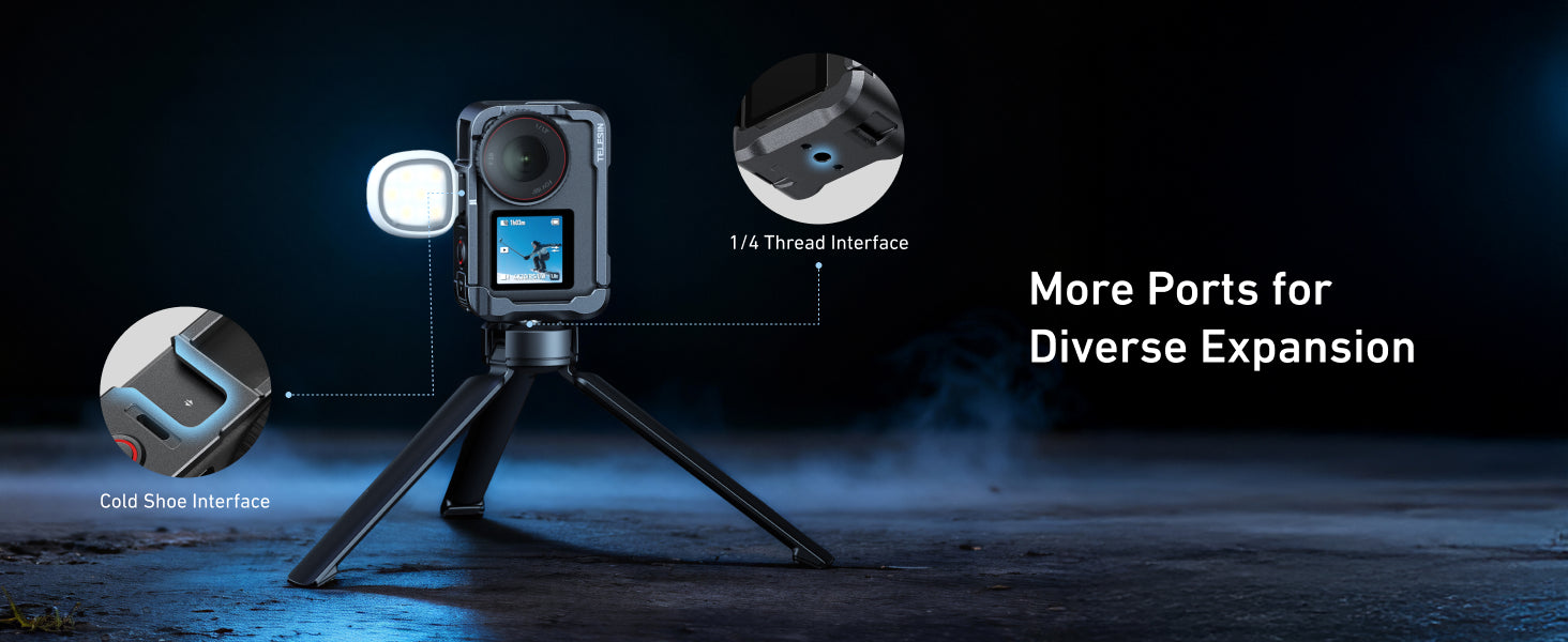 Note: Adapter base sold separately. - Versatile Expansion with Accessory Ports: Expand your filming setup with ease. The TELESIN Metal Cage for Action 6 includes both a 1/4 thread interface and a cold shoe interface, providing the flexibility to mount external accessories such as microphones, lights, and other gear. Whether you need a mic for better audio quality or a light for low-light conditions, this cage lets you customize your setup to your needs.