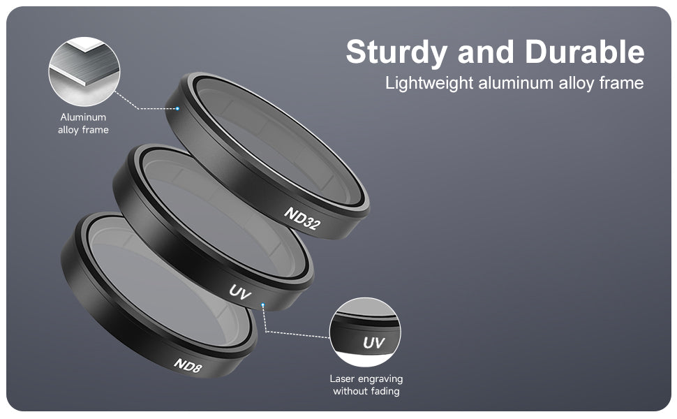 The frame of the filter is made from lightweight aluminum alloy, giving you a sturdy housing that can handle the bumps and knocks of real-world shooting. It offers high strength without adding unnecessary weight or bulk to your setup, so your Action 4/3 remains compact and easy to mount on helmets, handlebars or chest rigs.