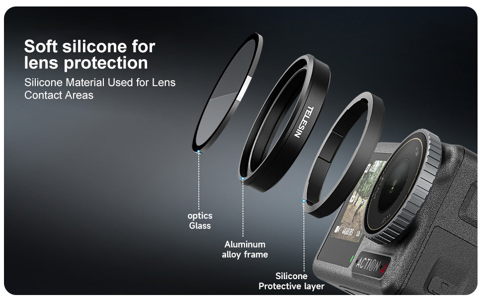 Where the filter meets the camera, TELESIN uses soft silicone protection in the contact areas. This helps cushion the connection between the aluminum frame and the lens bezel, reducing the risk of metal-to-glass contact, scratches or pressure marks on the camera body. The result is better protection for both the filter and the camera.