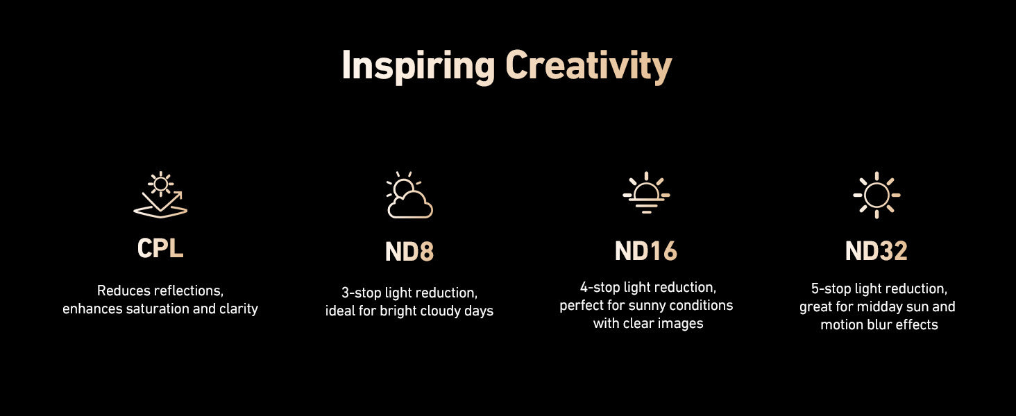 The ND filter set (ND8, ND16, ND32) helps you keep a natural shutter speed so your 4K/8K video looks smooth and cinematic, even in strong sunlight: