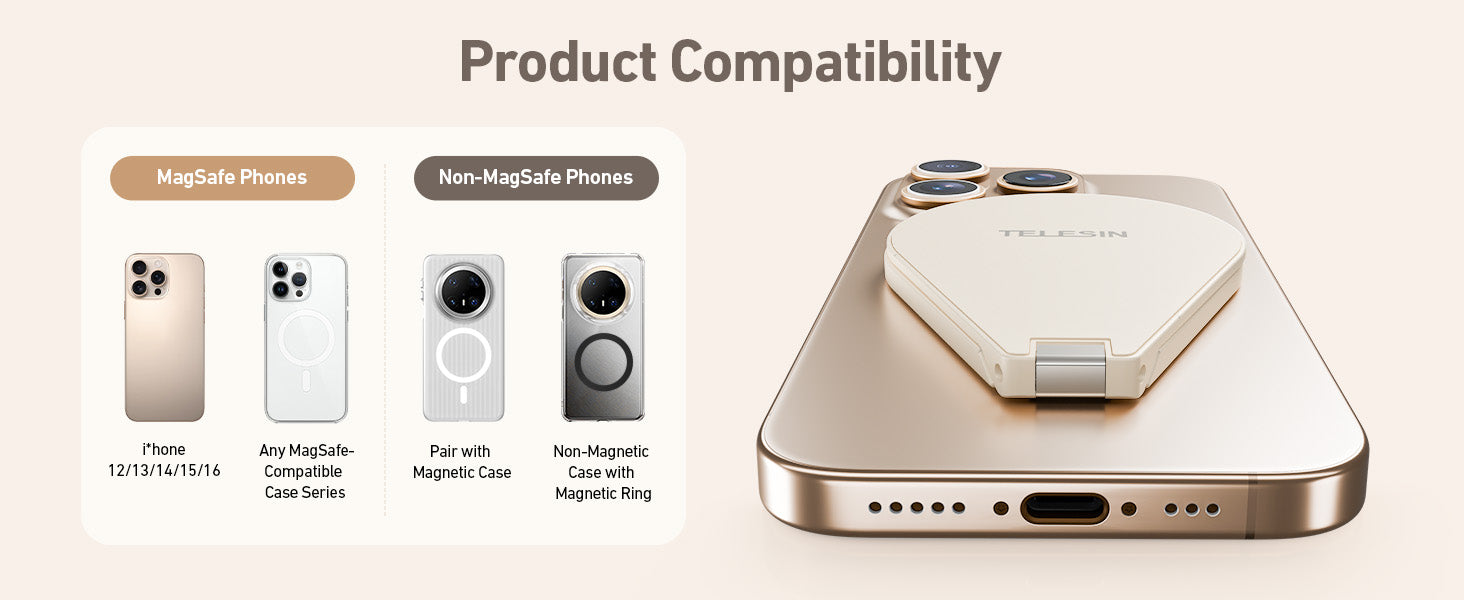 The TELESIN Waterdrop-shaped Phone Stand is a compact magnetic phone stand designed for people who use their phones all day—for creating, working, watching, and staying connected.