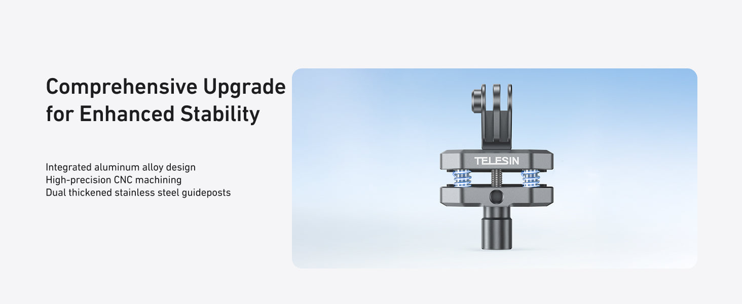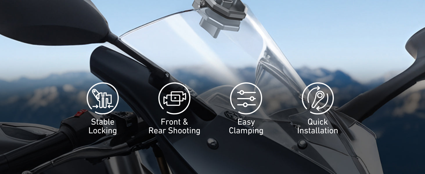 The TELESIN Windshield Clamp Mount is engineered with an integrated aluminum alloy frame and precision CNC machining, providing exceptional durability and stability. The dual thickened stainless steel guideposts prevent wobbling, ensuring smooth and steady footage even during intense rides or rough terrains.