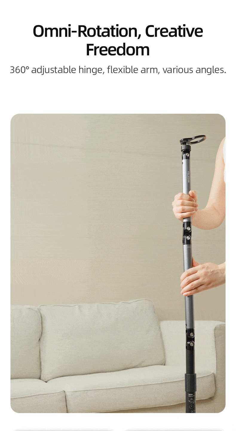 3.Damping rotating shaft, flexible angle, flexible adjustment at various angles for overhead shooting and vertical shooting.