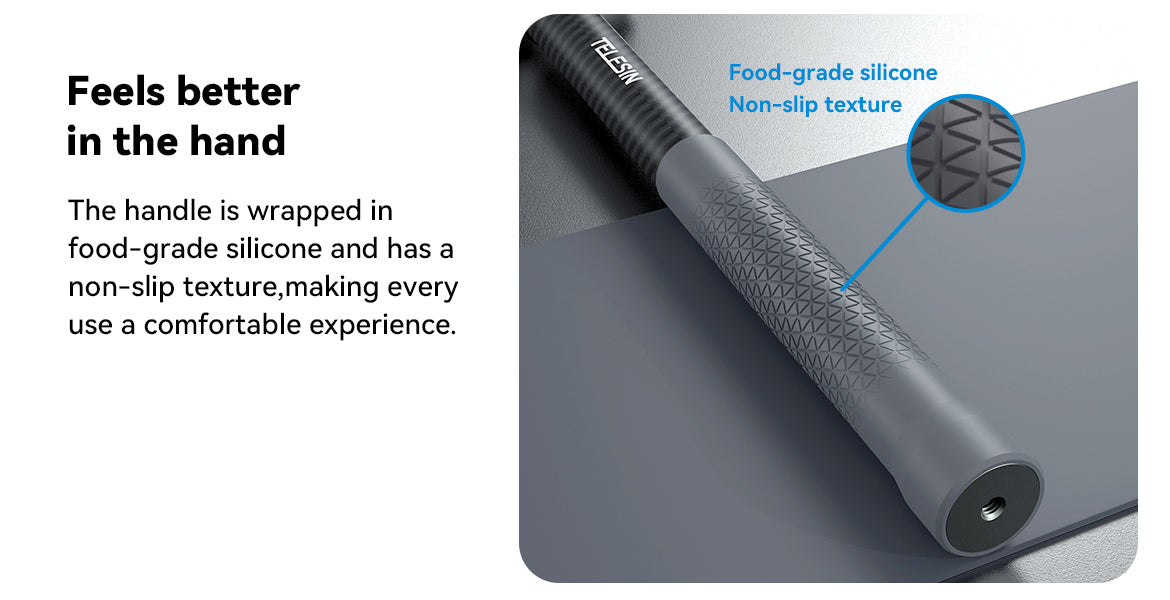 The food-grade silicone handle with a non-slip texture ensures a secure and comfortable grip, even during extended filming sessions.