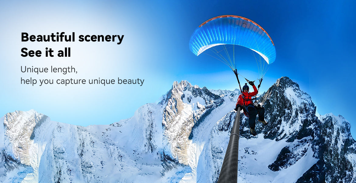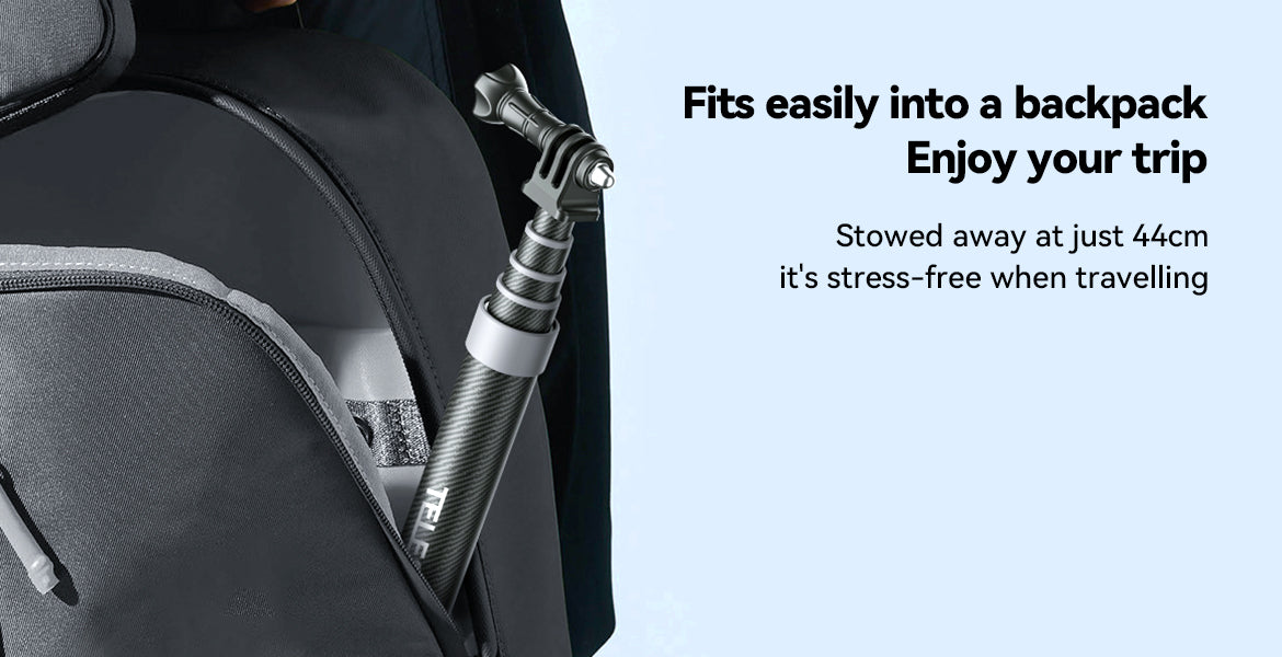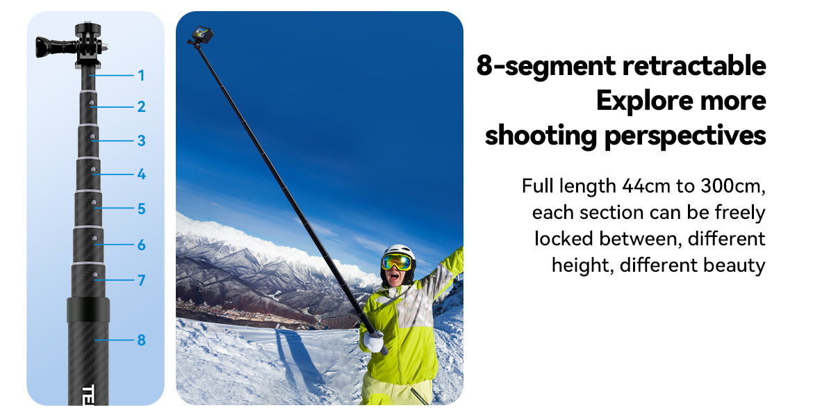 A3: The TELESIN 3M Carbon Fibre Selfie Stick extends from 44cm to 300cm (3 meters), allowing you to capture a variety of angles and perspectives, from close-up shots to wide panoramic views.