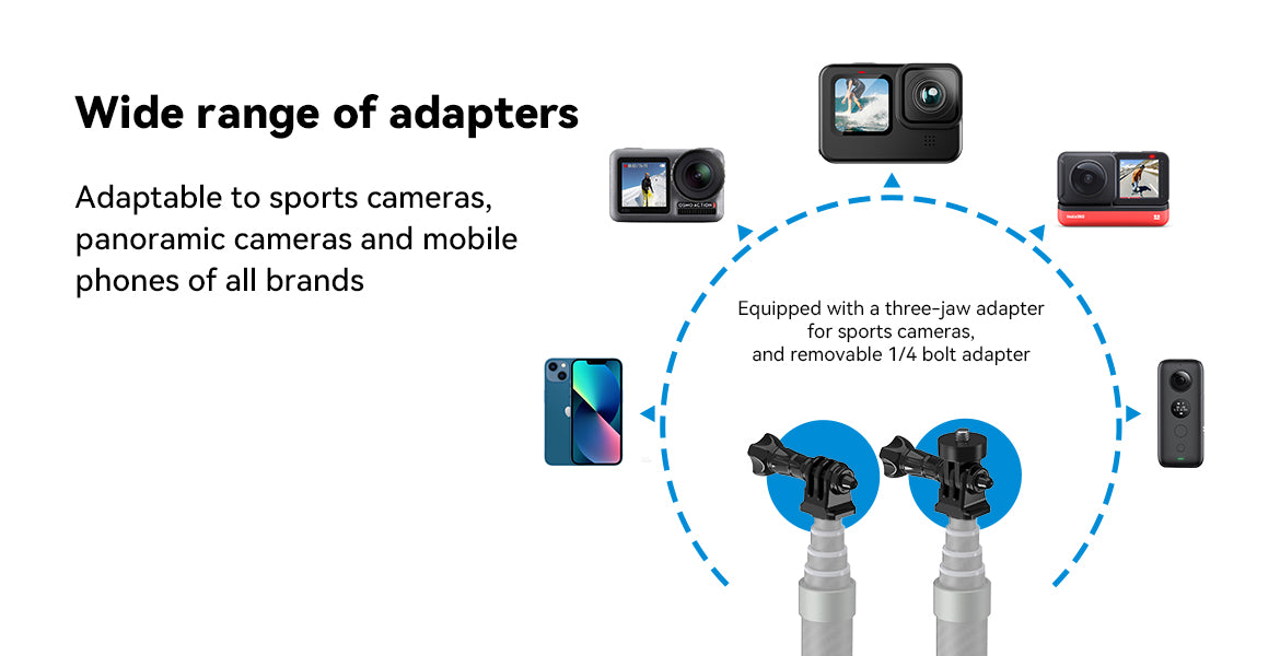 Three-jaw adapter for action cameras and removable 1/4 bolt adapter for smartphones.