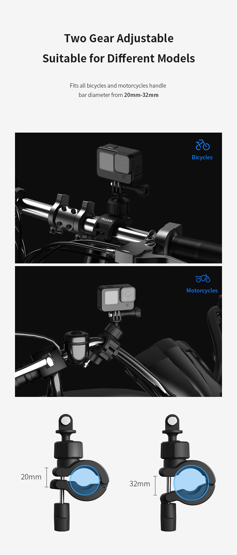 3. Two gear adjustable, suitable for different models, fits all bicycles and motorcycles handlebar diameter from 20mm-32mm.
