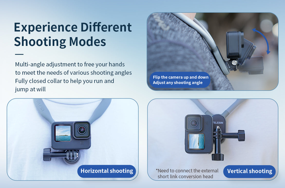 A9: Unlike traditional neck mounts, the TELESIN mount features a magnetic rotating interface for quick attachment, an ergonomic silicone collar for comfort, and compatibility with multiple camera brands.