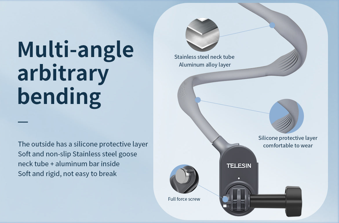 Capture every thrilling moment with ease. Whether you're skiing down a mountain, vlogging on your travels, or running through an intense race, the TELESIN neck phone holder is designed to keep your camera secure and your hands free—so you can focus on the action. With an ergonomic design, durable construction, and effortless installation, this mount is perfect for vloggers, athletes, and outdoor enthusiasts who demand comfort and stability.