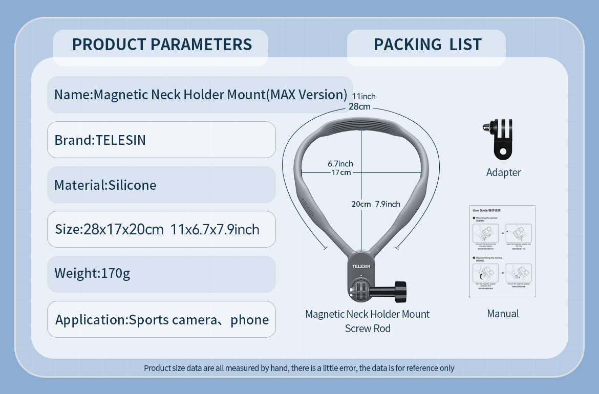 The TELESIN Magnetic Neck Holder Mount provides you with a hands-free filming experience that allows you to enjoy immersive, point-of-view shots while keeping your camera steady. The strong magnetic interface and adjustable angles make it perfect for both casual and professional use.